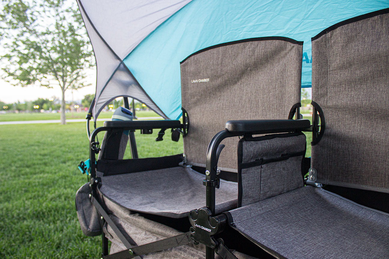 UPF 50+ canopy is quick to set up and take down. Folds down compact for easy storage on the end of Lawn Chariot