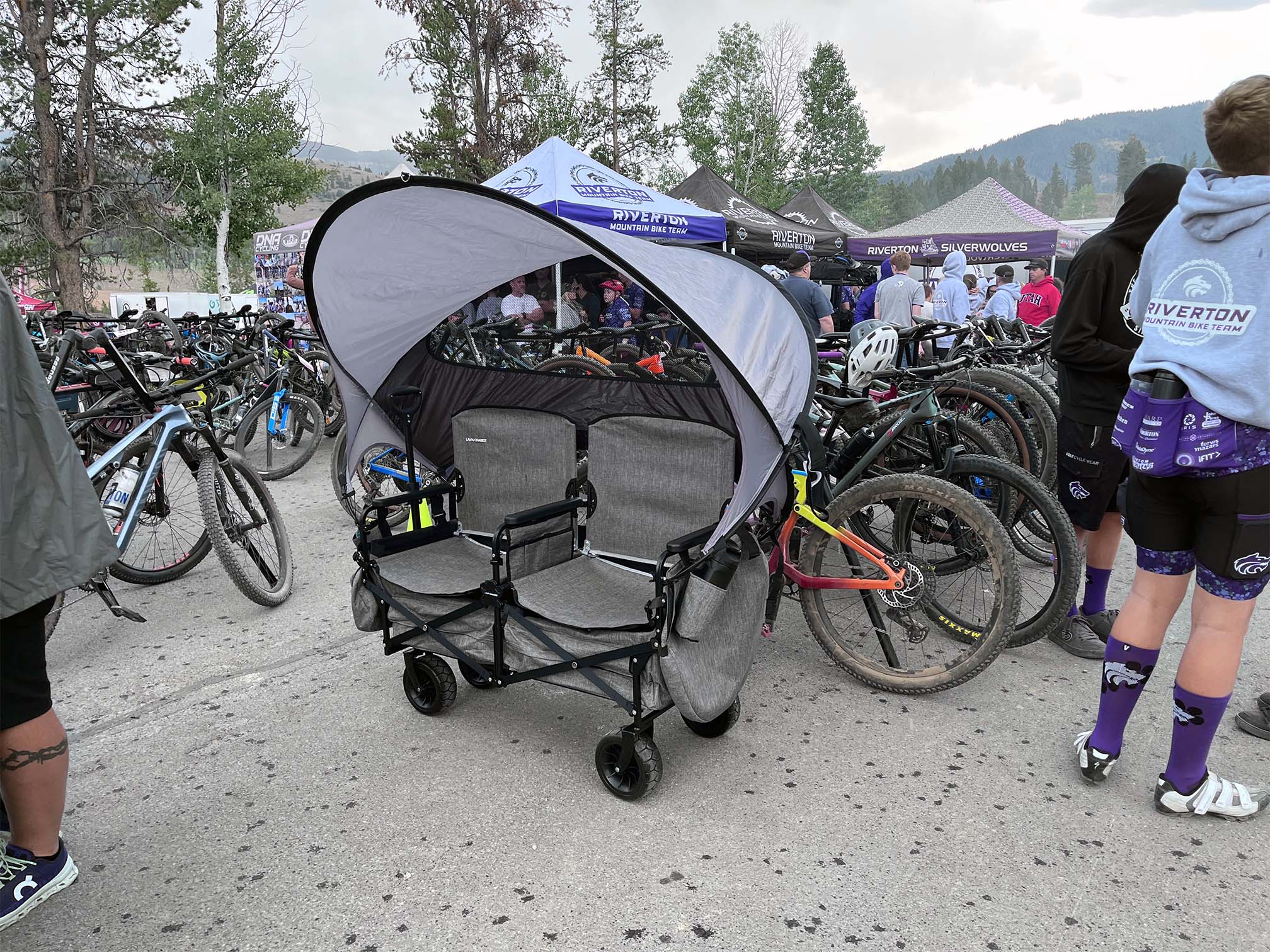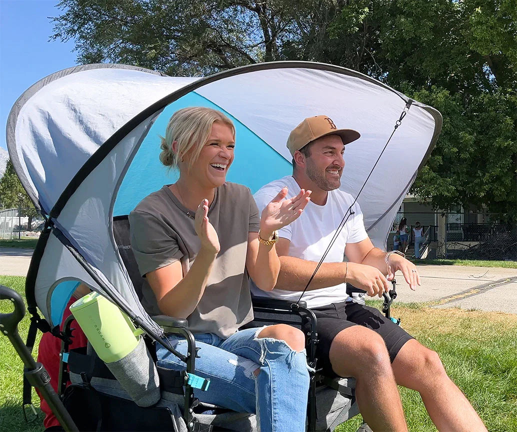 Roll from the parking lot to the team pit in one trip. Haul coolers, spare wheels, pumps, and helmets, then flip into two adult-height seats under UPF-50 canopy shade—for staging or spectating. Lock the wheels for a stable pit, stash valuables in under-seat storage, and when the action shifts, pull it to your viewing spot and reset in seconds—the comfortable, portable sideline HQ for cycling events and mountain bike races.