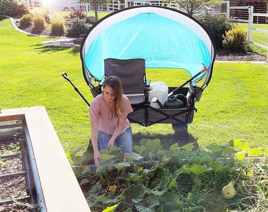 Create shade exactly where you work with a rolling garden wagon with seat. Take seated breaks at the bed, keep a cold drink handy, and haul soil, tools, and supplies in one trip. This portable gardening cart delivers shade, storage, and comfort so you can garden longer with less effort.